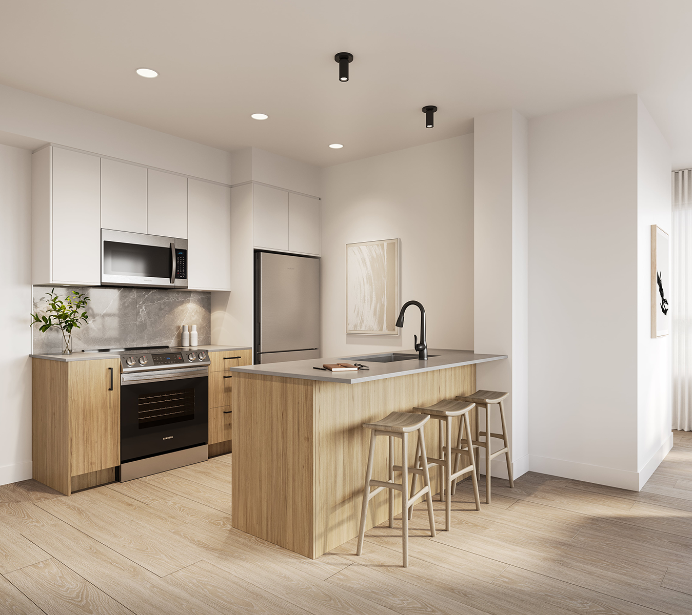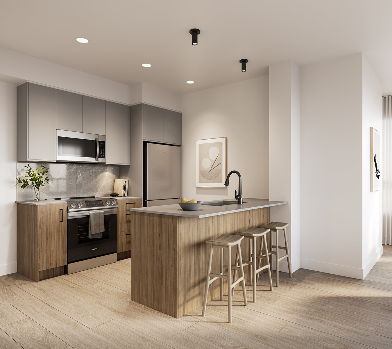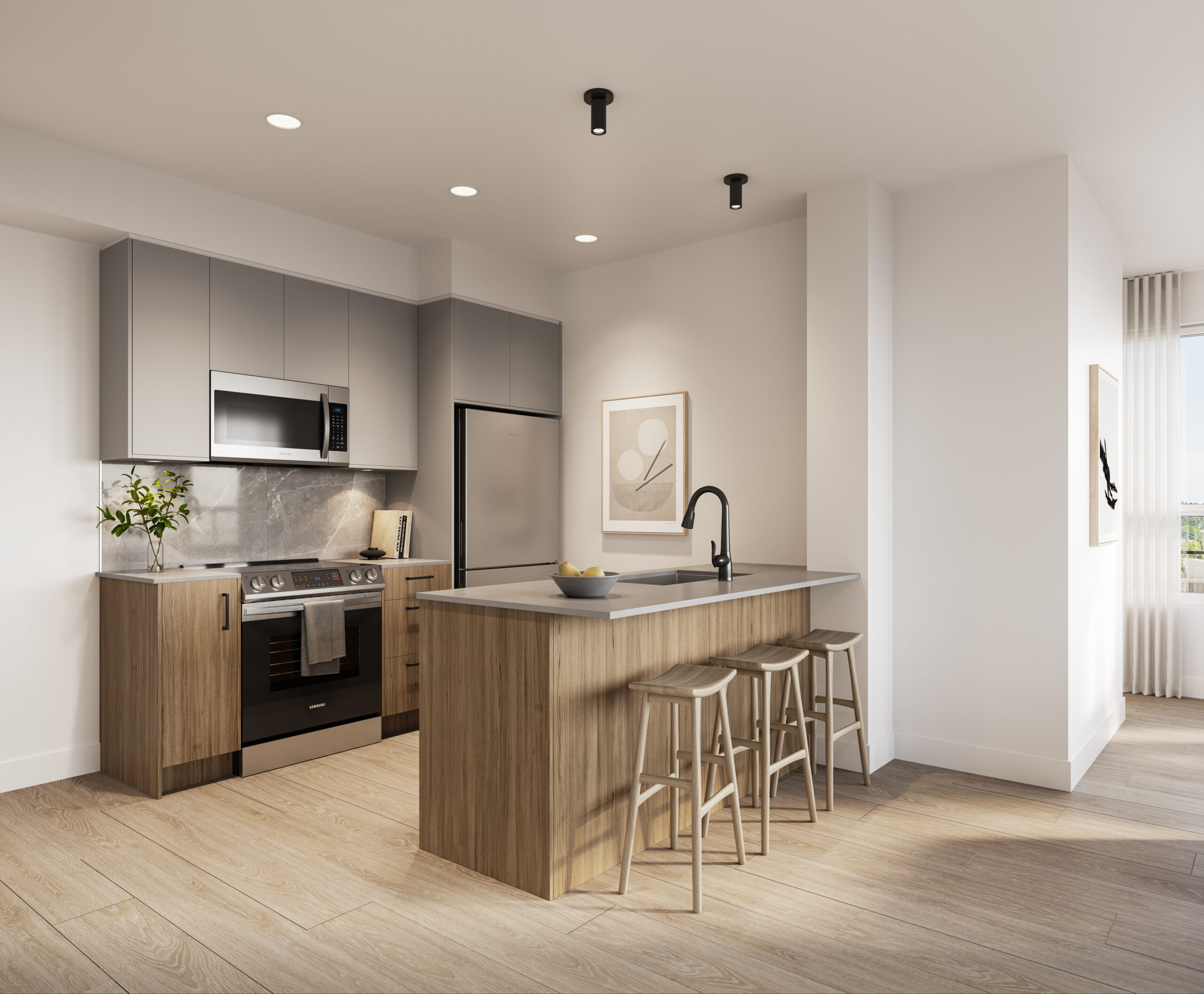 Ash - A modern interpretation of timeless tones. Seamlessly merging cool and warm, featuring enduring ash grey upper cabinetry and rich walnut cabinets below.