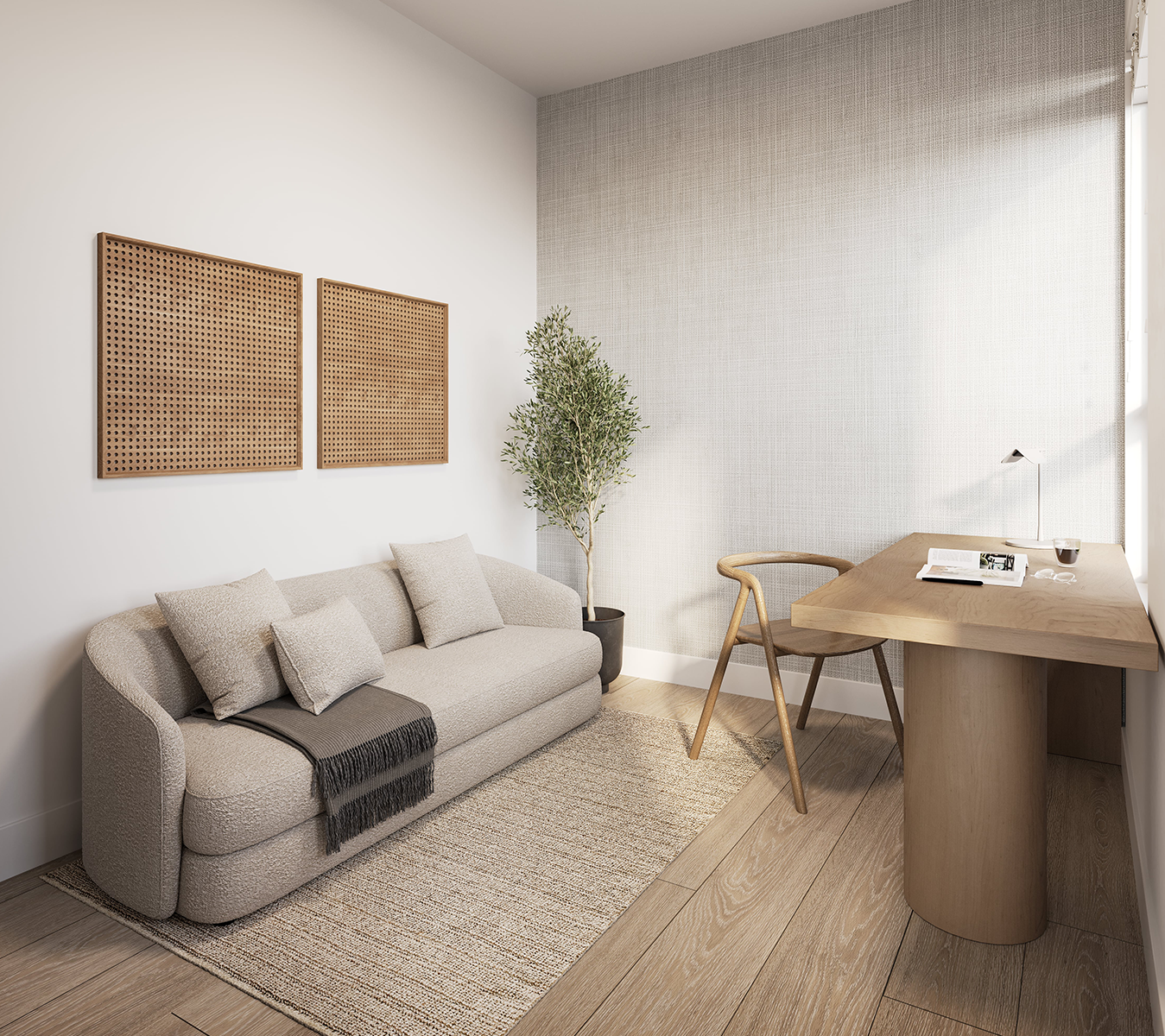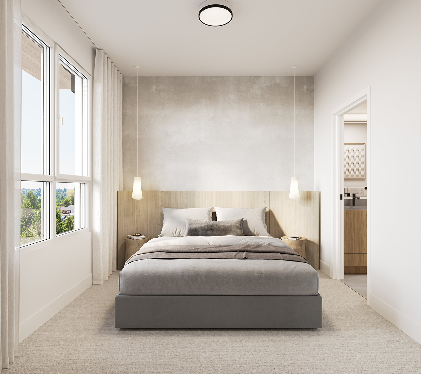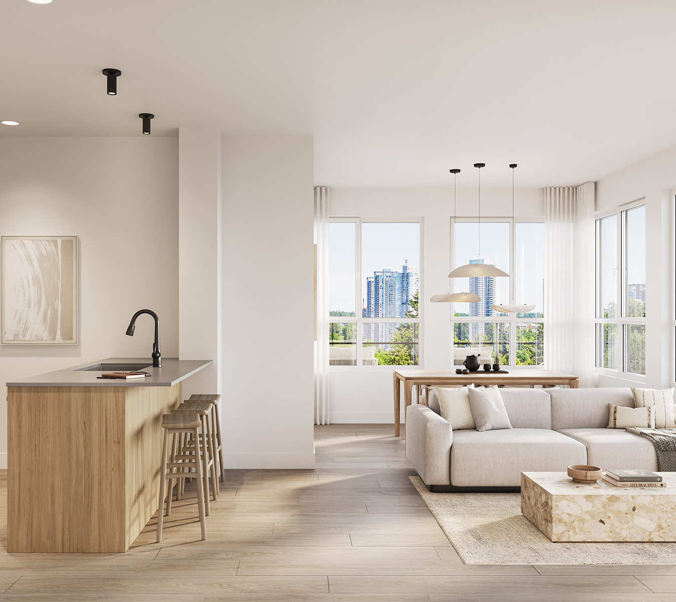 The kitchen countertops are adorned with stylish and durable Caesarstone in a raw concrete finish, adding an elemental touch to the interior design.