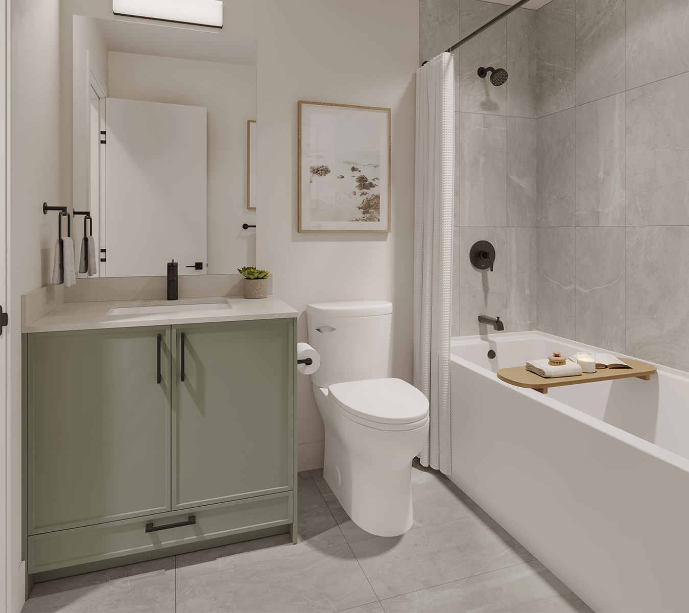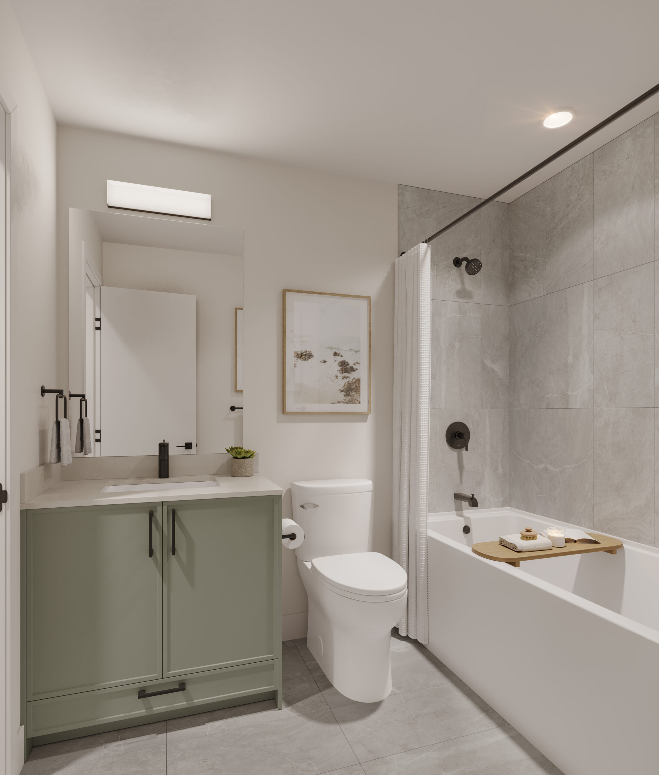 • Bright mirrors and cabinetry with soft-close drawers and doors.