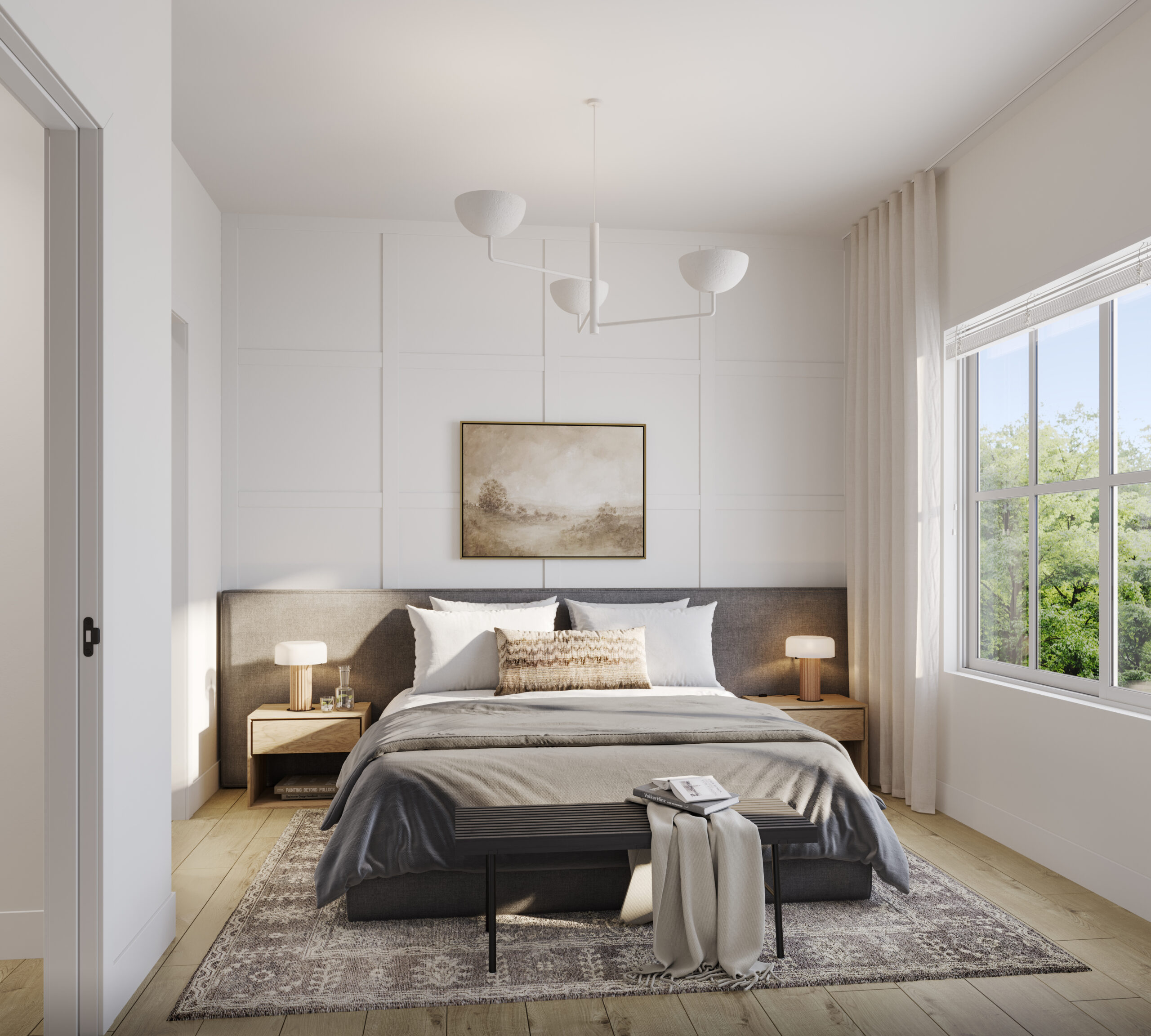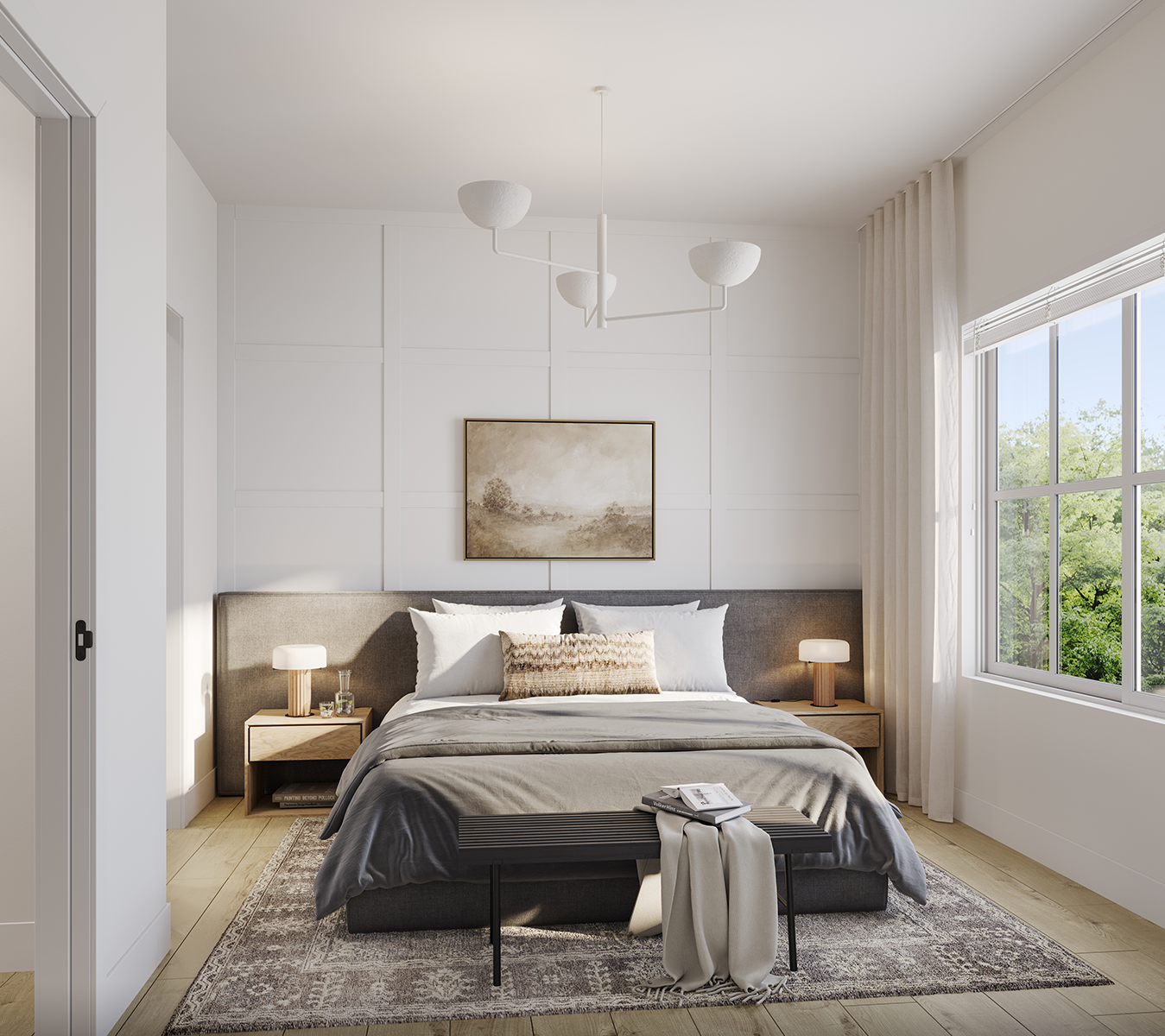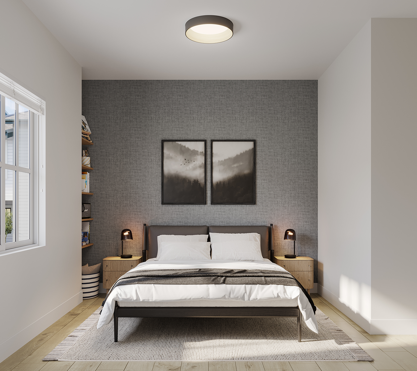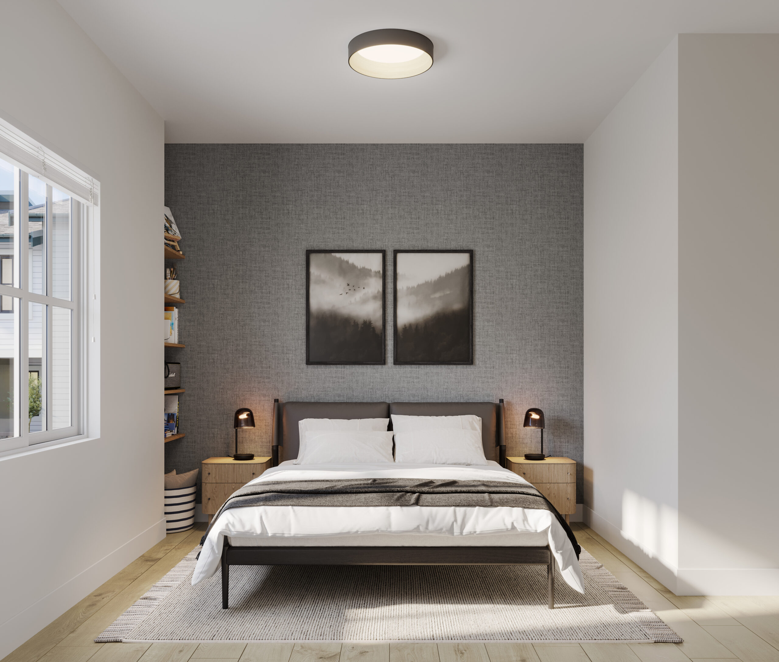FOG - Featuring off-white cabinets, this scheme exudes a sense of calm and lightness, perfect for a modern yet classic aesthetic. Complemented by oak laminate flooring for warmth and texture, thin shaker cabinets maintain a clean and minimalist appearance. Quartz countertops and backsplash provide durability and a luxurious finishing touch.