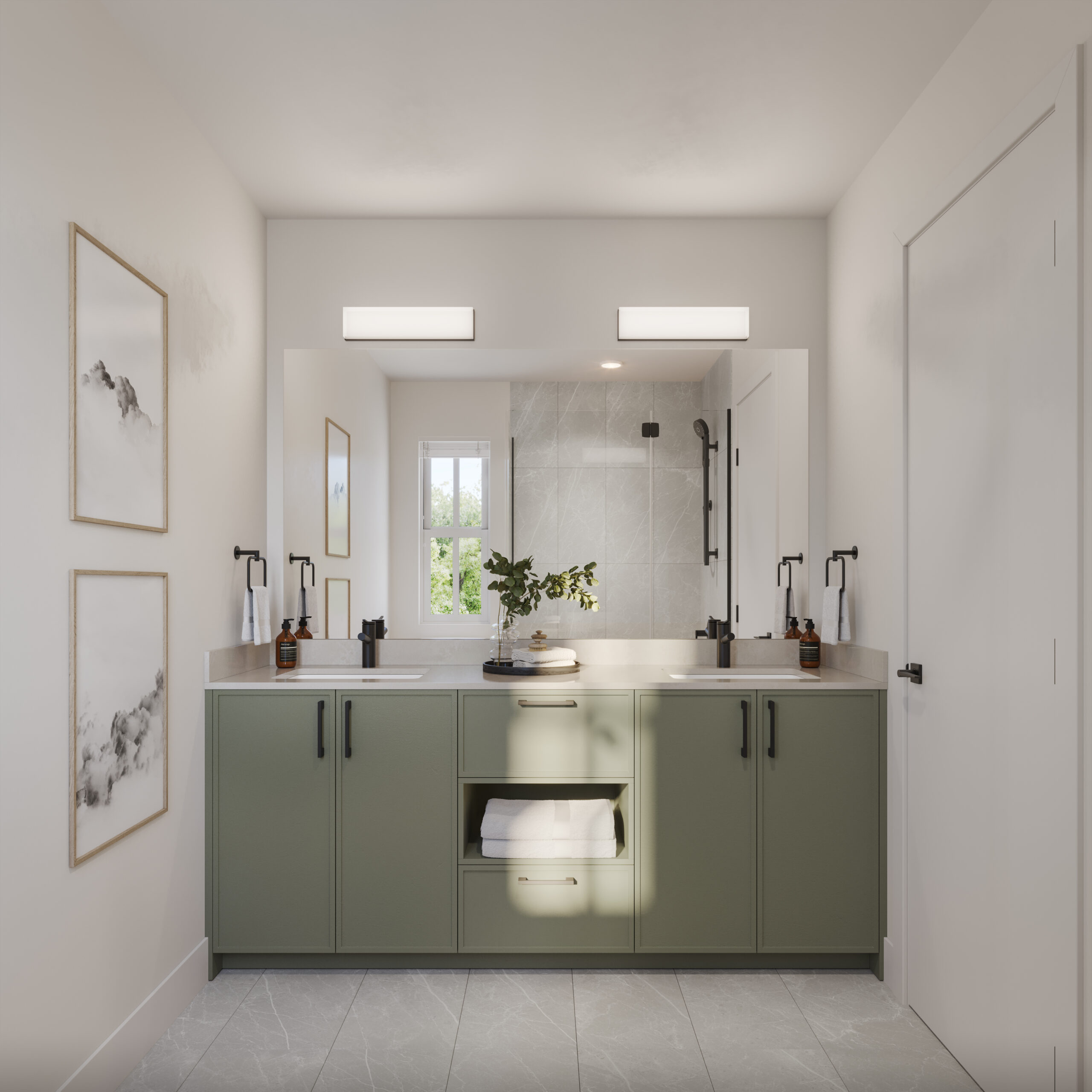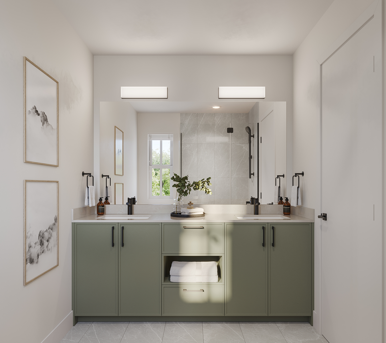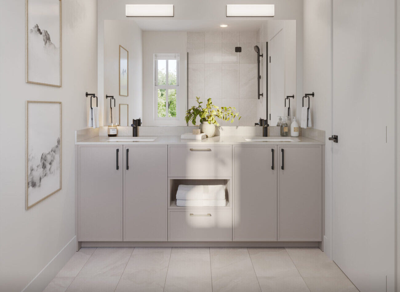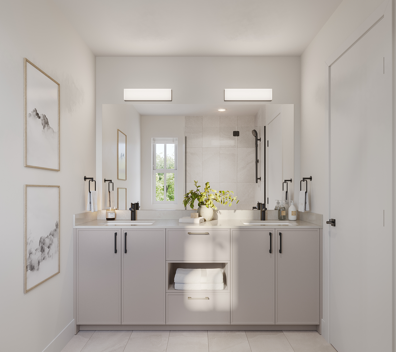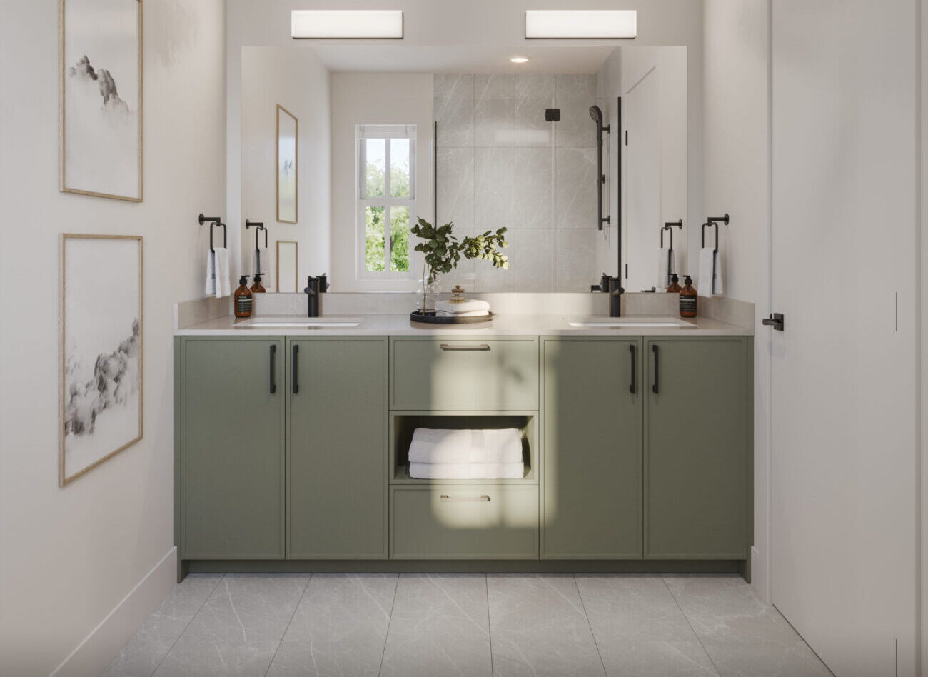 • Bathroom vanities provide functionality with plenty of space for toiletries.