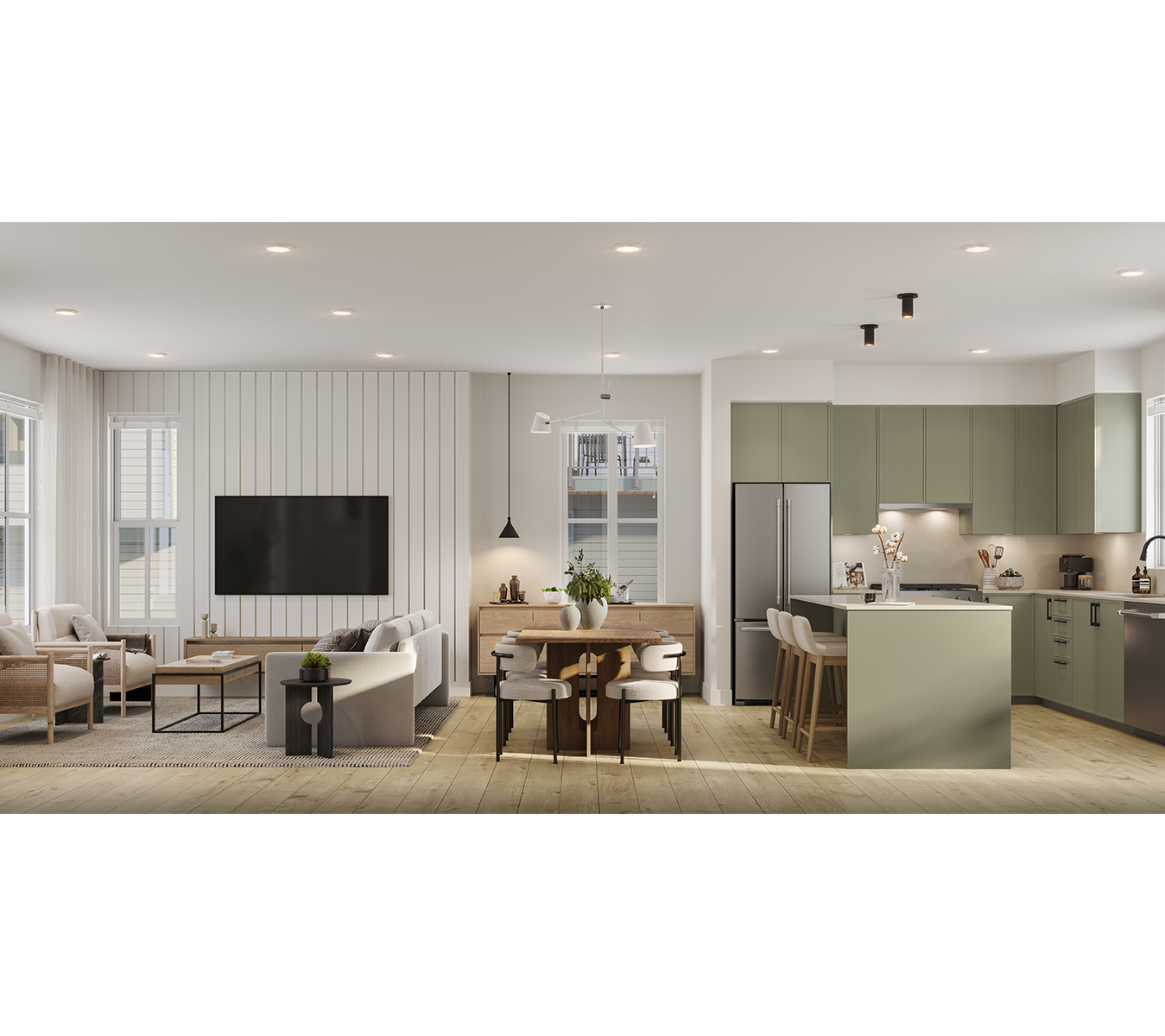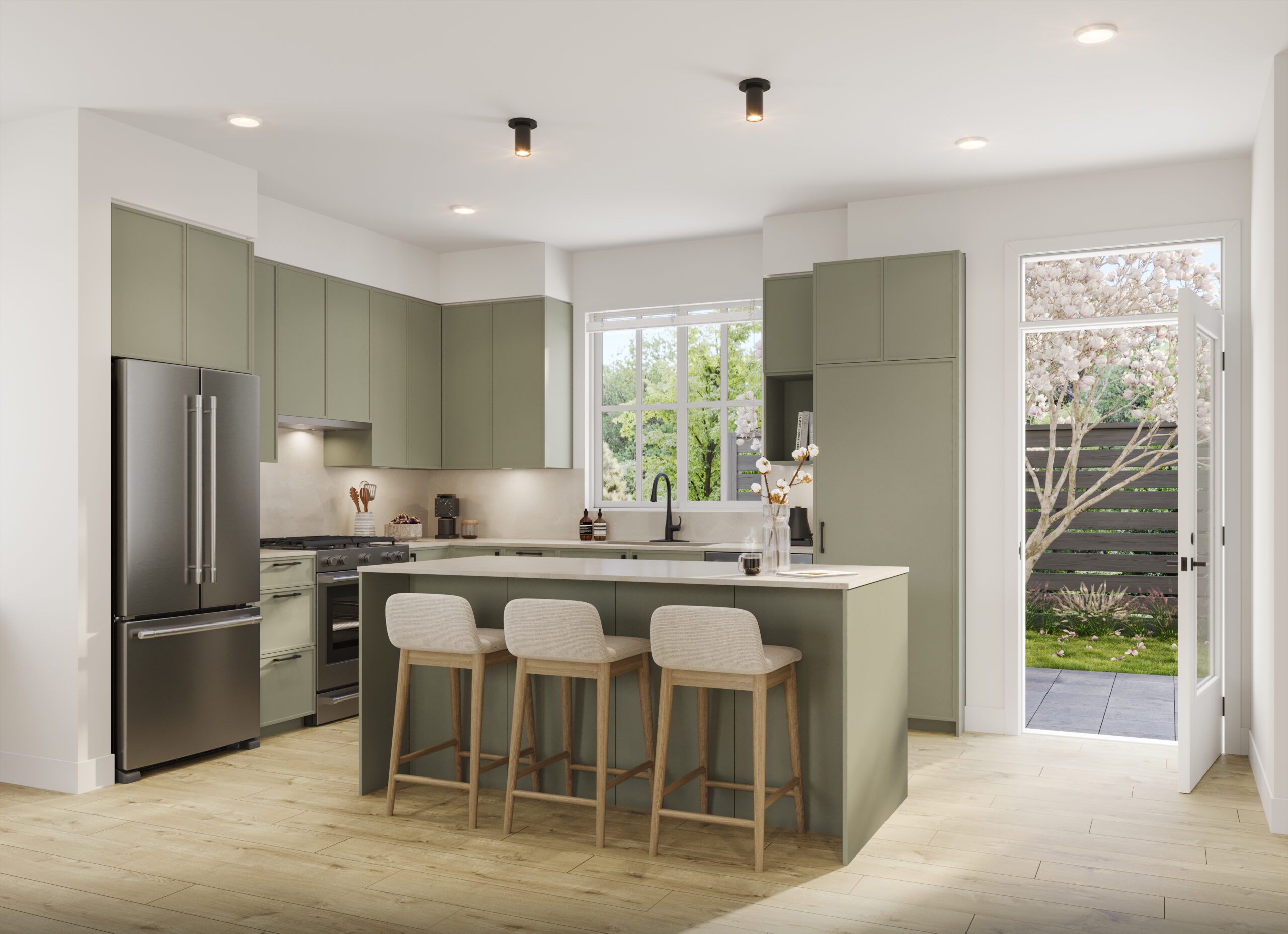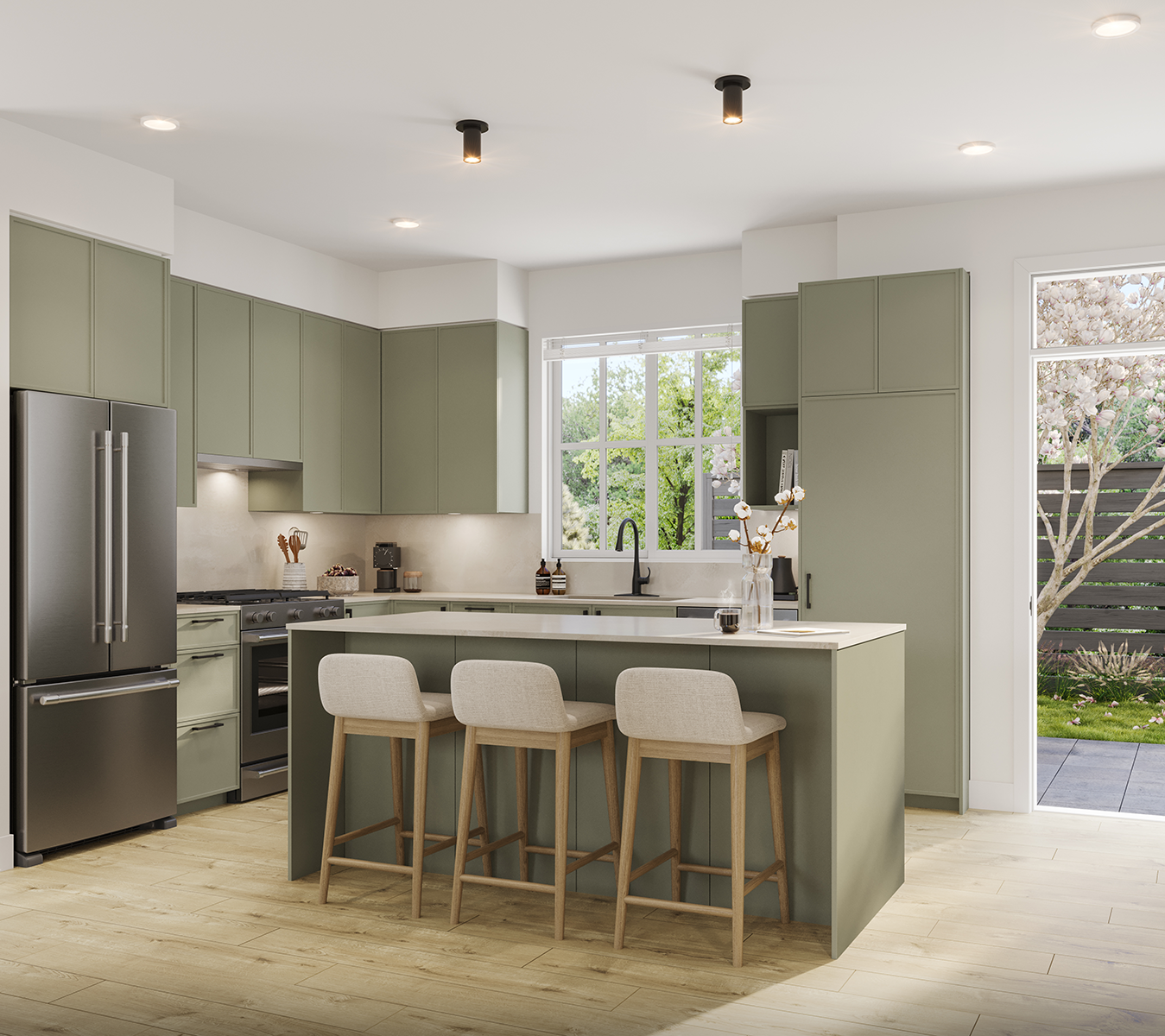 FERN - Featuring a soft green cabinet colour, this scheme creates a refreshing new look and brings a touch of nature into your kitchen. The thin shaker cabinets provide a sleek and modern look with black hardware adding a striking contrast. Quartz countertops and backsplash elevate the space with durability and sophistication.